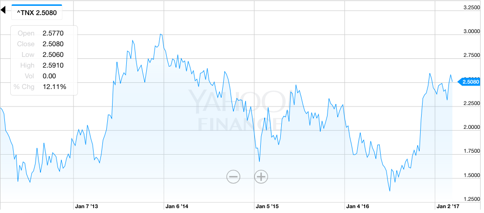 Συνεχίζοντας, υπάρχουν εποχές κατά τις οποίες τα αυξανόμενα επιτόκια συνοδεύονται από την άνοδο των τιμών των μετοχών – οπότε λέμε πως η συσχέτιση είναι θετική. Αυτή η τάση κυριαρχεί ιστορικά, όταν το επίπεδο των επιτοκίων είναι κάτω από το 5% – όπου όμως δεν εννοούμε τα βασικά επιτόκια της Fed, αλλά αυτά των δεκαετών ομολόγων του αμερικανικού δημοσίου, τα οποία σήμερα βρίσκονται περίπου στο 2,6% (γράφημα). Τα επιτόκια όμως αυτά δεν εξαρτώνται μόνο από τα βασικά αλλά, επίσης, από τη ζήτηση, ενώ ο κυριώτερος αγοραστής τους είναι η Κίνα, η οποία περιορίζει τις αγορές της – κάτι που είναι πολύ δύσκολο να αξιολογηθεί.