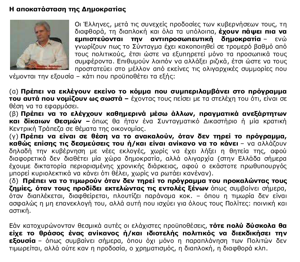 Η θλιβερή αλήθεια είναι πως αυτά που μπορεί να κάνει ένας λαός, όταν οδηγηθεί στην παγίδα του χρέους από τις κυβερνήσεις του, είναι πολύ λίγα – ειδικά όταν το Σύνταγμα επιτρέπει την υφαρπαγή της εξουσίας από κόμματα που δεν διστάζουν να αναλάβουν ψεύτικες δεσμεύσεις, γνωρίζοντας πως κανένας δεν θα τα τιμωρήσει, ενώ είναι αδύνατον να τα ανακαλέσει.