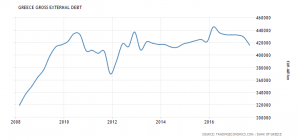 (α) το δημόσιο χρέος είναι σε μη μετατρέψιμο ξένο νόμισμα, εξωτερικό (=από μη εγχώριους, ξένους δανειστές) και εξαιρετικά υψηλό – στο 180% του ΑΕΠ ή σχεδόν στα 330 δις €,