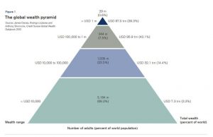 Στο γράφημα τώρα φαίνεται η παγκόσμια πυραμίδα του πλούτου – η μη ισορροπημένη αναδιανομή του οποίου είτε θα καταπολεμηθεί, είτε θα οδηγήσει τον πλανήτη σε πολύ μεγάλες περιπέτειες. Εάν κατασκεύαζε κανείς αυτήν την πυραμίδα με κριτήριο την αξία των εισοδημάτων της κάθε ομάδας, θα διαπίστωνε πως σχεδόν η μισή ανήκει σε μία ελάχιστη ελίτ – θα ήταν δηλαδή μπλε σκούρα.