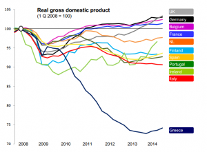 Μπορώ να αναφέρω πολλά αρνητικά για την ελληνική οικονομία – τα οποία τεκμηριώνουν πως η έξοδος από την τρίτη δανειακή σύμβαση θα είναι ένας εφιάλτης, εάν δεν στηριχθεί από την Ευρώπη και δεν υπάρξει διαγραφή μέρους του χρέους. Για παράδειγμα, το ότι η μακροοικονομική μας κατάσταση είναι πολύ χειρότερη από το 2010, όσον αφορά το δημόσιο χρέος, το κόκκινο ιδιωτικό, την απώλεια του 25% του ΑΕΠ (γράφημα δεξιά), την υπερβολική φορολόγηση (το 38% περίπου του εισοδήματος οδηγείται στην εφορία έναντι μόλις 14% στην Ιρλανδία), την κατακόρυφη πτώση των μισθών του ιδιωτικού τομέα κοκ.