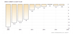 Κάτι ανάλογο ισχύει επίσης για το ισοζύγιο τρεχουσών συναλλαγών, το οποίο είχε σχεδόν ισοσκελισθεί ενώ σήμερα είναι ξανά αρνητικό (γράφημα) – παρά τη μεγάλη άνοδο του τουρισμού, λόγω των συγκυριών στην ευρύτερη περιοχή της Μεσογείου. Όσον αφορά δε το κόκκινο ιδιωτικό χρέος, αφενός μεν αυξήθηκε έκτοτε κατακόρυφα, αφετέρου η άνοδος του επιταχύνθηκε τους τελευταίους μήνες – γεγονός που δεν τεκμηριώνει την εξυγίανση της ελληνικής οικονομίας, όσο αισιόδοξος και αν είναι κανείς.