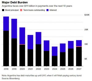 Το πρόβλημα της Αργεντινής τώρα είναι εντονότερο, από ότι νόμιζε κανείς, κρίνοντας από την τοποθέτηση της J.P. Morgan – κατά την οποία η κεντρική τράπεζα θα δυσκολευθεί να μετακυλήσει δάνεια ύψους περί τα 30 δις $ που λήγουν το 2018 (πηγή). Με δεδομένες επί πλέον τις ανάλογου ύψους ληξιπρόθεσμες υποχρεώσεις του 2019 (γράφημα), ίσως δεν πετύχει η προγραμματισμένη δημοπρασία LEBACS την επόμενη Τρίτη, με στόχο την αναχρηματοδότηση των 30 δις $. Εάν συνέβαινε κάτι τέτοιο, τότε αφενός μεν θα ζητούσε την άμεση παρέμβαση πλέον του ΔΝΤ, αφετέρου θα αυξανόταν οι εκροές κεφαλαίων από τους πανικοβλημένους επενδυτές, οι οποίες είναι ήδη μεγάλες – οπότε η Αργεντινή θα βυθιζόταν σε μία τεράστια κρίση, αντίστοιχη με αυτές των προηγουμένων δεκαετιών.