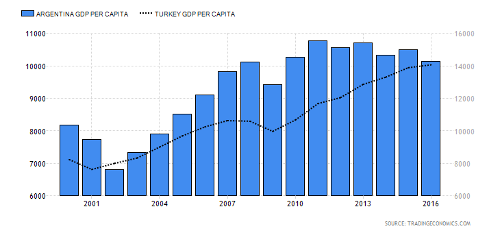 Έχοντας ήδη αναφερθεί στην οδυνηρή συνθηκολόγηση της το 2016 (άρθρο), στο γράφημα που ακολουθεί συγκρίνεται η άνοδος του κατά κεφαλήν ΑΕΠ της Αργεντινής μετά την πτώχευση της το 2001, με της Τουρκίας, η οποία δεν πτώχευσε μεν το 2001, αλλά αναγκάσθηκε να υπαχθεί στο ΔΝΤ – υπενθυμίζοντας πως αυτό που μετράει δεν είναι το ΑΕΠ μίας χώρας, αλλά το κατά κεφαλήν ΑΕΠ που δεν επηρεάζεται από τις πληθυσμιακές διακυμάνσεις.