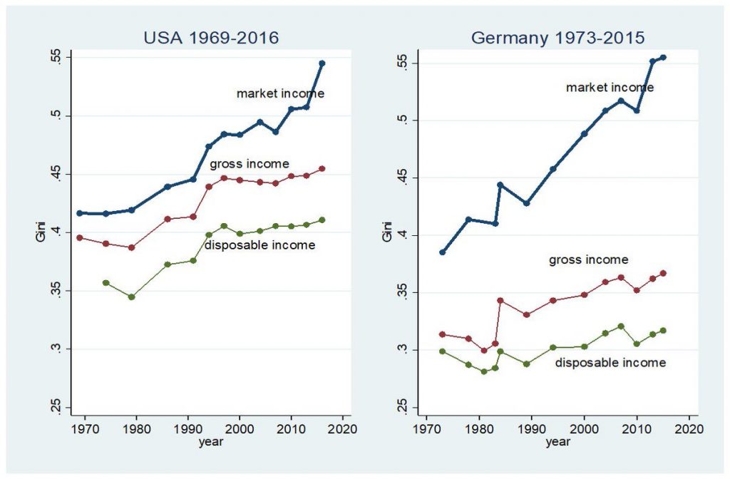 Ειδικά όσον αφορά τις εισοδηματικές ανισότητες, το γράφημα που ακολουθεί είναι χίλιες λέξεις, τεκμηριώνοντας πως η απόσταση μεταξύ φτωχών και πλουσίων στη Γερμανία είναι μεγαλύτερη από ποτέ – ακόμη πιο μεγάλη από ότι στις Η.Π.Α., όπως διαπιστώνεται από την εξέλιξη της μπλε καμπύλης στις δύο χώρες (market income inequality). Η αιτία είναι το ότι, από την άνοδο της χώρας ωφελούνται οι όλο και λιγότεροι πλουσιότεροι, οι οποίοι κερδίζουν από τις τοποθετήσεις τους στα ακίνητα, στις μετοχές κοκ., έχοντας τη δυνατότητα να αποφεύγουν την πληρωμή φόρων μέσω των φορολογικών παραδείσων. Επίσης τα υψηλά αμειβόμενα στελέχη των πολυεθνικών, οι μισθοί των οποίων υπερβαίνουν ακόμη και τα 10.000.000 € ετήσια!
