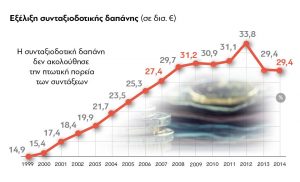 Η Ελλάδα δαπανούσε μέχρι πρόσφατα περί τα 30 δις € για συντάξεις ή το 17,4% του ΑΕΠ της. Παρά τη μείωση των συντάξεων, η συνταξιοδοτική δαπάνη δεν ακολούθησε μία ανάλογα πτωτική πορεία, ενώ ως προς το ΑΕΠ παρέμεινε υψηλή – κυρίως λόγω της κατακόρυφης πτώσης του κατά 27%, στην οποία πρέπει να προσθέσει κανείς το μέσο όρο ανάπτυξης των υπολοίπων χωρών της Ευρωζώνης κατά 10% (άρα το ΑΕΠ υστέρησε κατά 37%, αυξάνοντας σημαντικά την απόσταση από τους άλλους εταίρους μας). Η εξέλιξη της δαπάνης φαίνεται από το γράφημα που ακολουθεί (πηγή: protagon).