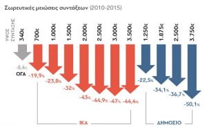 Περαιτέρω, τα 2,6 εκ. συνταξιούχοι έχουν υποστεί μεγάλες μειώσεις από το 2010 έως πρόσφατα οι οποίες ήταν οι εξής (πηγή:euro2day):