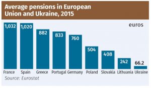 Για να έχουμε τώρα κάποια εικόνα, οι μέσες συντάξεις στην Ευρώπη κυμαίνονται από 250 € μηνιαία, έως 1.600 €, όπου στην Ελλάδα ήταν στα 882 € (713 € κύρια και 169 € επικουρική), στην Πορτογαλία 833 €, στην Ισπανία 1.020 €, στη Λιθουανία 242 €, στη Σλοβακία 408 €, στην Πολωνία 504 € και στη Γαλλία 1.032 € (συν από 25% έως 50% επικουρική).
