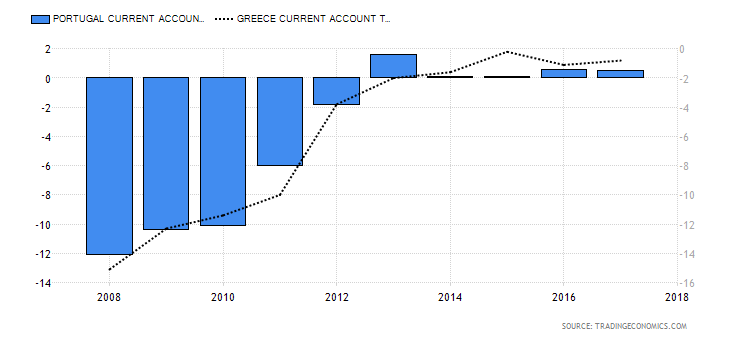 Το εμπορικό έλλειμμα της Πορτογαλίας είναι ύψους 13,9 δις € (21,4 δις € της Ελλάδας το 2017), το οποίο ισοσκελίζεται από τα έσοδα του τουρισμού και από τα εμβάσματα των οικονομικών μεταναστών που εγκατέλειψαν χώρα – ενώ σήμερα οι εισαγωγές αυξάνονται ξανά με μεγαλύτερο ρυθμό, από ότι οι εξαγωγές της. Επομένως η ανταγωνιστικότητα της συνεχίζει να είναι αδύναμη, οπότε προβλέπεται πως το ισοζύγιο τρεχουσών συναλλαγών της θα επιδεινωθεί, όπως συμβαίνει ήδη με την Ελλάδα – παρά την πτώση των μισθών (γράφημα).