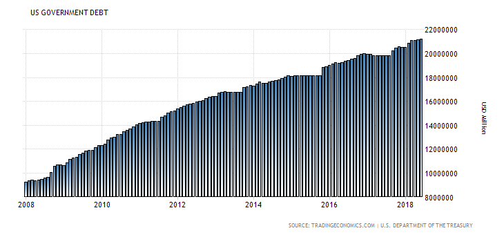 Ουσιαστικά χρεοκόπησαν το 2008 οι εμπορικές τράπεζες, υπερχρεώθηκαν τα κράτη για να τις διασώσουν, αμέσως μετά υπερχρεώθηκαν οι κεντρικές τράπεζες για να διασώσουν τα κράτη και σήμερα είναι οι πάντες υπερχρεωμένοι – με τις Η.Π.Α. να επιλέγουν τον προστατευτισμό, τον εμπορικό και φορολογικό πόλεμο, για να αντιμετωπίσουν το υπέρογκο χρέος τους που έχει υπερδιπλασιαστεί μετά το 2008 (γράφημα), καθώς επίσης τα δίδυμα ελλείμματα τους που όμως δεν υποχωρούν.