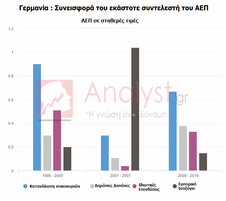 Το γεγονός αυτό φαίνεται από το γράφημα, όπου από το 2001 έως το 2007 το ΑΕΠ της στηρίχθηκε σχεδόν εξ ολοκλήρου στο εμπορικό ισοζύγιο (μαύρη στήλη, εξαγωγές μείον εισαγωγές) – ενώ επιτυγχάνεται με την πολιτική της φτωχοποίησης του γείτονα (ανάλυση), την οποία υποστήριξε η ΕΚΤ εις βάρος όλων των άλλων κρατών (ανάλυση). Χρησιμοποίησε δε κάθε θεμιτό ή αθέμιτο μέσον, χωρίς ως συνήθως ηθικές αναστολές όπως την απάτη, το ξέπλυμα μαύρου χρήματος, τους φορολογικούς παραδείσους κοκ. (άρθρο) – καταφέρνοντας τελικά αφενός μεν να ξεπληρώσει με τη βοήθεια των εταίρων της το τεράστιο κόστος της εξυγίανσης της Ανατολικής Γερμανίας (150 δις € ετήσια για πάνω από δέκα χρόνια), αφετέρου να αναδειχθεί στην πρώτη πλεονασματική χώρα του πλανήτη, με τη βοήθεια της αύξησης των εξαγωγών σε συνδυασμό με τη μείωση των εισαγωγών της.