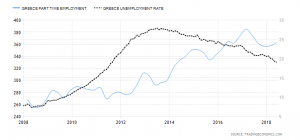 Ειδικά όσον αφορά τις συντάξεις, οι Έλληνες γνωρίζουν ασφαλώς πώς έχουν ληστευθεί τα συνταξιοδοτικά ταμεία, οπότε ουσιαστικά πληρώνονται από τις κρατήσεις των εργαζομένων – με αποτέλεσμα να είναι αδύνατη η μη περικοπή τους, όταν οι μισθοί παραμένουν καθηλωμένοι και η ανεργία στα ύψη (η πτώση της είναι πλασματική, αφού προέρχεται κυρίως από την άνοδο της μερικής απασχόλησης, γράφημα).