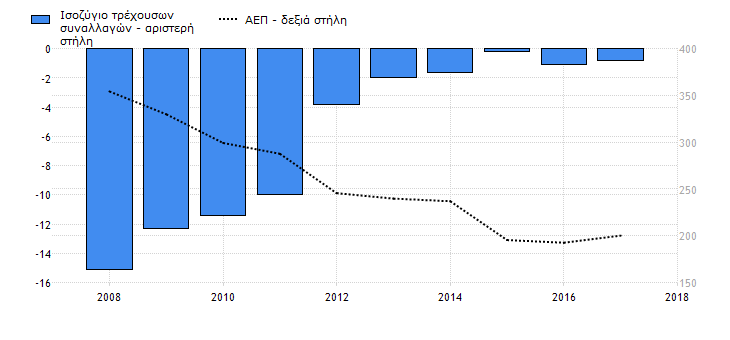 Δεν υπάρχει καμία αμφιβολία σχετικά με το ότι, στην καλύτερη περίπτωση η Ελλάδα είναι καταδικασμένη στη στασιμότητα – μεταξύ άλλων επειδή ο τραπεζικός της τομέας είναι στα όρια της χρεοκοπίας, το δημόσιο και ιδιωτικό χρέος της είναι εκτός ελέγχου, δεν διενεργούνται επενδύσεις λόγω της υπέρογκής φορολόγησης σε συνδυασμό με τη χαμηλή ζήτηση, ενώ όταν αυξάνεται το ΑΕΠ της κλιμακώνεται αυτόματα το έλλειμμα του ισοζυγίου τρεχουσών συναλλαγών της, κυρίως επειδή αυξάνονται οι εισαγωγές λόγω της κατάρρευσης του παραγωγικού της ιστού (γράφημα)