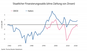 Φυσικά ενοχοποιείται η αγορά εργασίας της, για την οποία λέγεται πως δεν λειτουργεί σωστά, με αποτέλεσμα να εμποδίζεται η ανάπτυξη – χωρίς να δίνεται σημασία στο γεγονός ότι, η υποαπασχόληση στην Ιταλία οφείλεται κυρίως στη συμφωνία του Μάαστριχτ. Σε μία συμφωνία, η οποία απαγορεύει σε όλα τα κράτη που έχουν οφειλές άνω του 60% του ΑΕΠ τους να χρεώνονται – για να επεμβαίνουν εξισορροπητικά όταν ο ιδιωτικός τομέας μειώνει τις δαπάνες του και το εξωτερικό δεν συμπληρώνει τη ζήτηση που λείπει. Για παράδειγμα η Ιταλία, πειθαρχώντας στους κανόνες του Μάαστριχτ, είχε πρωτογενή πλεονάσματα συνεχώς μετά το 1992 (γράφημα, μπλε καμπύλη, κόκκινη χώρες του ΟΟΣΑ) – οπότε αφαιρούσε διαρκώς ζήτηση από την οικονομία της.