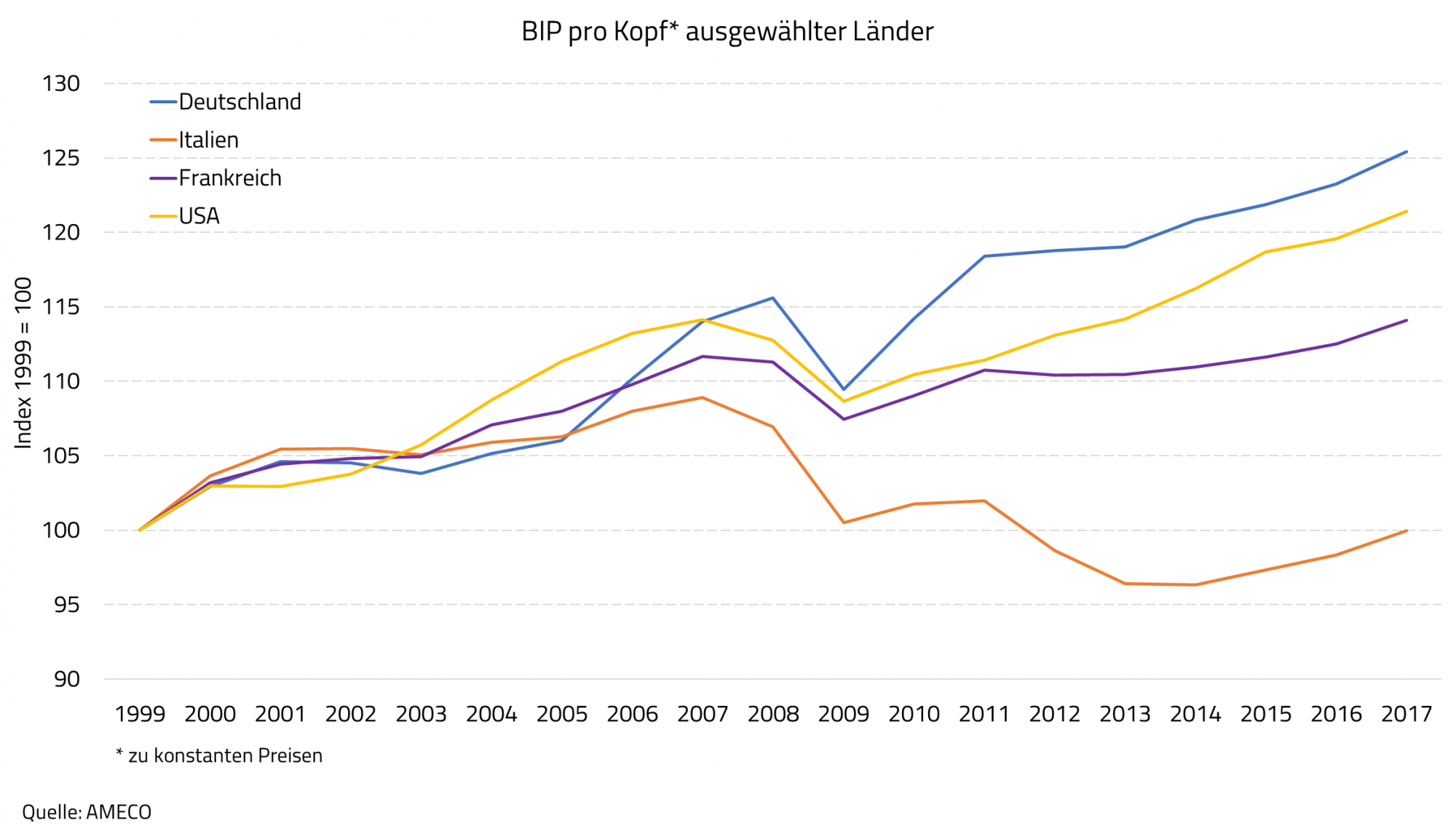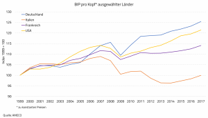 Λογικά λοιπόν το κατά κεφαλή ΑΕΠ της (γράφημα, πορτοκαλί καμπύλη) εξελίχθηκε εντελώς αντίθετα, από όλες τις άλλες χώρες (Γερμανία, Η.Π.Α., Γαλλία) – με αποτέλεσμα να είναι χαμηλότερο από τότε που υιοθέτησε το ευρώ. Εκτός αυτού, αντί να χαλαρώσει η πολιτική λιτότητας μετά τη χρηματοπιστωτική κρίση του 2008 και την ευρωπαϊκή που ακολούθησε το 2010, «συσφίχθηκε» – αφού υιοθετήθηκαν ακόμη πιο αυστηροί κανόνες, όπως το ονομαζόμενο «Six Pack» το 2011, καθώς επίσης το «Two Pack» το 2013.