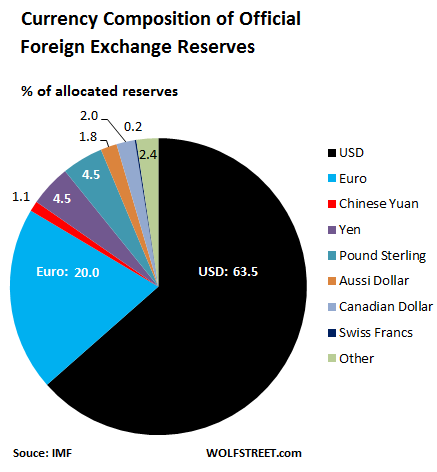 (α) Το δολάριο κατέχει το 63% των παγκόσμιων συναλλαγματικών αποθεμάτων, ενώ το ευρώ μόλις το 20% – με τα υπόλοιπα νομίσματα να έχουν αμελητέα ποσοστά (γράφημα). Όσον αφορά τα ομόλογα σε ξένο νόμισμα, η εικόνα είναι περίπου η ίδια – αφού σε δολάρια είναι το 62%, ενώ σε ευρώ το 23%. Ακόμη δε και οι εισαγωγές προϊόντων εκ μέρους της Ευρωζώνης διενεργούνται μόλις κατά 50% σε ευρώ – ενώ των Η.Π.Α. κατά 90% σε δολάρια.