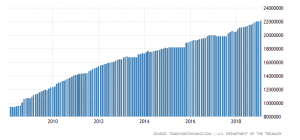 Ειδικότερα, το δημόσιο και ιδιωτικό χρέος των Η.Π.Α. από μόλις 3,084 τρις $ το 1980 (ή 38.552 $ ανά νοικοκυριό ή 79% του μέσου ετησίου εισοδήματος των νοικοκυριών), έφτασε στα 15,4 τρις $ το 2000 (147.560 $ ανά νοικοκυριό, 280% των μέσων ετησίων εισοδημάτων) και εκτοξεύθηκε στα 41,1 τρις $ το 2016 (329.961 $ ανά νοικοκυριό, 584% των μέσων ετησίων εισοδημάτων!). Όσον αφορά μόνο το δημόσιο χρέος, από 8 τρις $ περίπου το 2008 εκτινάχθηκε στα 22 τρις $ σήμερα (γράφημα)- όπου, εάν οι Η.Π.Α. δεν διέθεταν το παγκόσμιο αποθεματικό νόμισμα, το δολάριο, εκτυπώνοντας κατά το δοκούν χρήματα για να εξυπηρετούν το υπέρογκο χρέος τους, θα ήταν ήδη σε μία απελπιστική θέση.