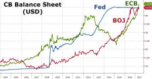 Ειδικά όσον αφορά τη σημερινή χρηματοπιστωτική κρίση, αφού προηγουμένως οι κυβερνήσεις διέσωσαν τις εμπορικές τράπεζες, στη συνέχεια οι τράπεζες διέσωσαν τα κράτη – ενώ πρόσφατα τόσο οι τράπεζες, όσο και τα κράτη, διασώθηκαν από τις κεντρικές τράπεζες με τη βοήθεια της μαζικής εκτύπωσης χρημάτων. Ποιός όμως θα διασώσει τις κεντρικές τράπεζες στο μέλλον; Ο πληθωρισμός; Στο γράφημα που ακολουθεί, φαίνεται πόσο είχαν διογκωθεί οι ισολογισμοί των κεντρικών τραπεζών το 2017 – έχοντας έκτοτε αυξηθεί ακόμη περισσότερο.