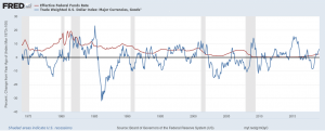 (β) Σε σχέση με το δεύτερο, ο σταθμισμένος δείκτης του δολαρίου (γαλάζια γραμμή στο γράφημα, με κόκκινη το επιτόκιο της Fed), μετά τη «συμφωνία της Plaza» του 1985, όπου οι υπουργοί οικονομικών των χωρών των G7 αποφάσισαν να ελέγχουν από κοινού τη συναλλαγματική ισοτιμία του δολαρίου (ανάλυση), έχει ετήσιες ποσοστιαίες διακυμάνσεις το ανώτατο +-15%. Η άνοδος όμως της ισοτιμίας του δολαρίου το 2013, ως αποτέλεσμα της ανακοίνωσης εκ μέρους του κ. Bernanke του τέλους του QE, προκάλεσε σειρά ζημιών στις αναπτυσσόμενες οικονομίες, καθώς επίσης στις αγορές πρώτων υλών – αν και για ένα περιορισμένο χρονικό διάστημα.