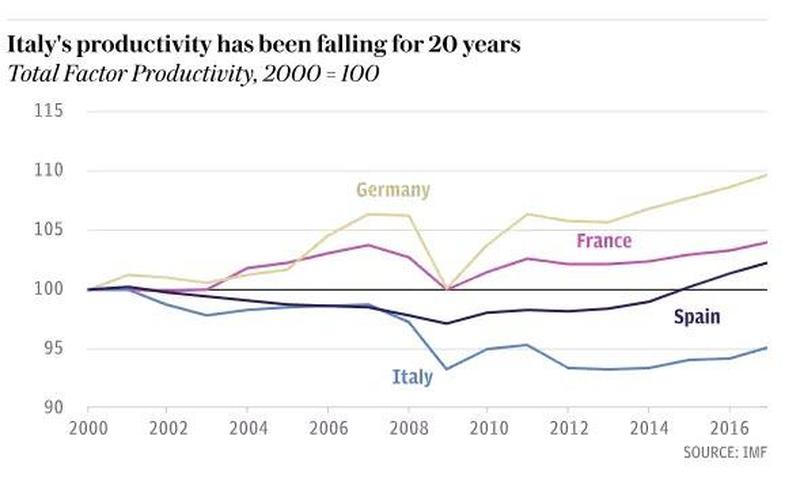 Ξεκινώντας από την Ιταλία, είναι αναμφισβήτητο γεγονός ότι, η παραγωγικότητα της μειώνεται συνεχώς μετά την υιοθέτηση του ευρώ (γράφημα) – ενώ οδεύει σε μία ύφεση διαρκείας με μεγάλους κινδύνους (πηγή), ανάλογης με αυτήν της Ιαπωνίας μετά το κραχ του 1989. Ένα τέτοιο ενδεχόμενο θα καθιστούσε αδύνατο τον έλεγχο του δημοσίου χρέους της, εφόσον το μέσο επιτόκιο δανεισμού της θα είναι σταθερά υψηλότερο από το ρυθμό ανάπτυξης – κενό που δεν μπορεί να καλύψει ούτε με δημοσιονομικά πλεονάσματα αφού θα μείωναν ακόμη περισσότερο την ανάπτυξη, ούτε με ιδιωτικοποιήσεις.