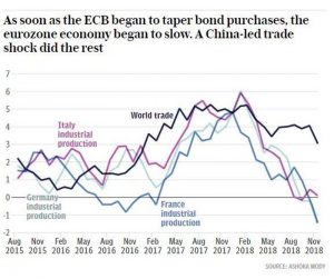 Επόμενο πρόβλημα της Ιταλίας αλλά και γενικότερα της Ευρωζώνης είναι το πρόωρο σταμάτημα του QE από την ΕΚΤ, κατ’ εντολή προφανώς της Γερμανίας – ένα πρόγραμμα που η ΕΚΤ ξεκίνησε πολύ πιο αργά από τη Fed (το 2015, ενώ η Fed το 2008/09), με αποτέλεσμα να προκληθεί τότε η ευρωπαϊκή κρίση χρέους.