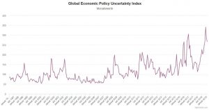 Εν προκειμένω ο δείκτης GEPU που αφορά την παγκόσμια οικονομική αβεβαιότητα (γράφημα), είναι ο σταθμισμένος ως προς το ΑΕΠ μέσος όρος των εθνικών δεικτών 16 χωρών, οι οποίες είναι «υπεύθυνες» για το 70% περίπου της παγκόσμιας παραγωγής – όπου, χωρίς να επεκταθούμε σε περιττές λεπτομέρειες, έχει ήδη υπερβεί κάθε προηγούμενο ρεκόρ.