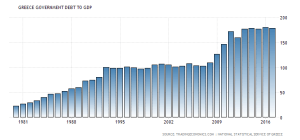 (1) Η Ελλάδα υπερχρεώθηκε τη δεκαετία του 1980, όπως φαίνεται από το γράφημα δεξιά – ενώ με τις θηριώδεις σπατάλες που αύξαναν το χρέος, οικοδομήθηκε το πελατειακό κράτος και διεφθάρη ολόκληρη η κοινωνία.