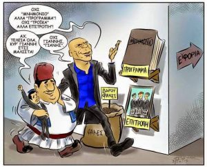 Ακριβώς το ίδιο έχει αναφέρει ο κ. Βαρουφάκης, μετά την παταγώδη διαπραγματευτική αποτυχία του, για τον κ. Σόιμπλε – υπερηφανευόμενος επίσης πως δεν το δέχτηκε και πολέμησε για την πατρίδα του! Υπενθυμίζουμε εδώ πως όταν ο κύριος αυτός ανέλαβε υπουργός οικονομικών, (α) τάθηκε υπέρ της δημιουργικής ασάφειας, (β) ήταν οπαδός του «70% καλού μνημονίου», (γ) υπέγραψε την απόφαση του γερμανικής κατασκευής, άτυπου και παράνομου Euro Group της 20ης Φεβρουαρίου, με την οποία το ΣΥΡΙΖΑ που «θα καταργούσε τα Μνημόνια», αποδέχτηκε τα μνημόνια των προηγούμενων – διαβεβαιώνοντας τρόικες και θεσμούς ότι, «οι Ελληνικές αρχές επαναλαμβάνουν την κατηγορηματική τους δέσμευση να τηρήσουν τις οικονομικές τους υποχρεώσεις προς όλους τους πιστωτές πλήρως και εγκαίρως… απέχοντας από οποιαδήποτε κατάργηση μέτρων και μονομερείς αλλαγές», (δ) δεν οχύρωσε τις τράπεζες με ελέγχους κεφαλαίων, οπότε διέφυγαν 33 δις € καταθέσεις στο εξωτερικό και (ε) έδωσε τη δυνατότητα στην ΕΚΤ να τις κλείσει, παγιδεύοντας κυριολεκτικά τον Πρωθυπουργό με την πλάτη στον τοίχο.