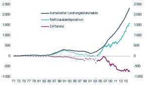 Οι αποταμιεύσεις τώρα αυτές, οι οποίες δεν επενδύονται εντός της Γερμανίας, οδηγούνται νομοτελειακά στο εξωτερικό μέσω των τραπεζών, αναζητώντας κερδοφόρες τοποθετήσεις – είτε ως κλασσικές επενδύσεις στην πραγματική οικονομία άλλων κρατών, είτε με άλλες μορφές. Σύμφωνα όμως με έναν πρόσφατο υπολογισμό (πηγή), τα συνολικά σωρευτικά πλεονάσματα της Γερμανίας έως το 2016 ήταν της τάξης των 2,4 τρις €. Εν τούτοις, τα σωρευτικά περιουσιακά στοιχεία της χώρας στο εξωτερικό έως το τρίτο τρίμηνο του 2016 ήταν μόλις 1,59 τρις € (στο γράφημα 350 το σωρευτικό ισοζύγιο τρεχουσών συναλλαγών της Γερμανίας με τη μαύρη καμπύλη και η καθαρή θέση της στο εξωτερικό με τη γαλάζια σε δις € – η διαφορά με τη μωβ γραμμή).