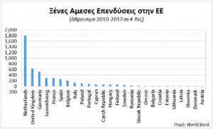 Κλείνοντας το θέμα των επενδύσεων, κατά την άποψη μας η κυβέρνηση θεωρεί σανίδα σωτηρίας και αυτοσκοπό τις ξένες επενδύσεις. Γιατί όμως αλήθεια υπολείπεται ως προς αυτές η Ελλάδα, σε σχέση με την υπόλοιπη ΕΕ (γράφημα);