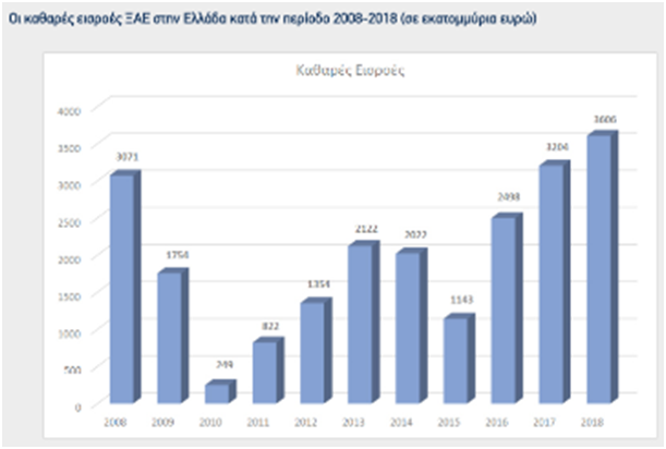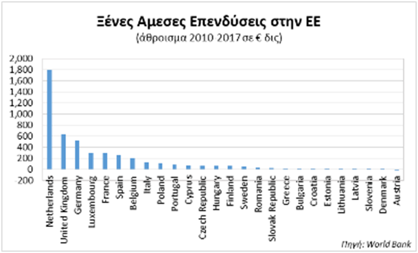 Κλείνοντας το θέμα των επενδύσεων, κατά την άποψη μας η κυβέρνηση θεωρεί σανίδα σωτηρίας και αυτοσκοπό τις ξένες επενδύσεις. Γιατί όμως αλήθεια υπολείπεται ως προς αυτές η Ελλάδα, σε σχέση με την υπόλοιπη ΕΕ (γράφημα);