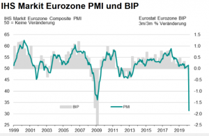 Μεταξύ άλλων με τη βοήθεια του δείκτη επιχειρηματικής εμπιστοσύνης στην Ευρωζώνη (ΡΜΙ), συγκριτικά με το 2008 – όπου όταν βρίσκεται στο 50 σημαίνει «καμία αλλαγή». Διαπίστωσε λοιπόν πως η μέχρι στιγμής πτώση του είναι μεν σχεδόν ανάλογη, αλλά η εξέλιξη του τότε από μήνα σε μήνα ήταν σχετικά μικρή, σε σύγκριση με την απότομη σημερινή – με την έννοια πως μία πτώση κατά 20 μονάδες μέσα σε ένα μήνα δεν έχει συμβεί ποτέ (γράφημα).
