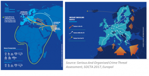 Με βάση την μελέτη της Europol για τους Κινδύνους από Σημαντικό Έγκλημα (Serious And Organised Crime Threat Assessment, SOCTA 2017, Europol) Ελλάδα και Τουρκία βρίσκονται στη Βαλκανική οδό μετακίνησης ηρωίνης από Ασία (Αφγανιστάν, Πακιστάν) και την διακίνηση ατόμων. Η χρήση δεν των ναρκωτικών στην Ευρώπη έχει αυξηθεί τις τελευταίες δεκαετίες κάνοντας της διαδρομή όλο και πιο σημαντική. Η Βαλκανική οδός είναι η συντομότερη διαδρομή μεταξύ Αφγανιστάν (κύριος παραγωγός όπιου) και Ευρώπης. Όταν τα εμπορεύματα μπαίνουν στην Τουρκία «σπάνε» σε τρείς οδούς την Βόρεια την Νότια και την Δυτική. Ενώ με μικρά σκάφη (κότερα) φτάνουν μέχρι την Ισπανία. Επίσης θεωρείται ότι Αλβανικές και Τουρκικές συμμορίες οργανωμένου εγκλήματος δραστηριοποιούνται και στην χονδρική και λιανική διάθεσης ηρωίνης στις περισσότερες χώρες της ΕΕ (Kleemans, 2004; Paoli & Reuter, 2008; Reuter & Trautmann, 2009; EMCDDA & Europol, 2013). Παράλληλα κάνναβη από την Αλβανία κατευθύνεται προς την Τουρκία για αγορά ηρωίνης.