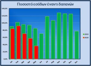 Λόγω του οικονομικού της μοντέλου λοιπόν, η ύφεση θα φανεί τα επόμενα τρίμηνα – με τις προβλέψεις να την τοποθετούν άνω του 10%, χωρίς να λαμβάνεται υπ’ όψιν ένα δεύτερο κύμα COVID-19 στις περιοχές που αποτελούν τουριστικούς ή εξαγωγικούς «πελάτες» της, πόσο μάλλον στην ίδια. Με δεδομένο δε το ότι, ήδη υποχωρούν ραγδαία τα δημόσια έσοδα, ενώ αυξάνονται οι δαπάνες (γράφημα), όπως φαίνεται από την εκτέλεσε του προϋπολογισμού το πεντάμηνο (πηγή), το μέλλον της διαγράφεται δυσοίωνο – χωρίς καμία διάθεση απαισιοδοξίας.