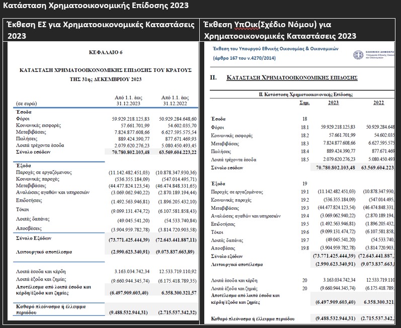Γενικότερα πάντως, υπάρχουν διάφορα ποσά για τα έσοδα από φόρους του 2023 – όπως 59,9 δις € στην κατάσταση Χρηματοοικονομικής Επίδοσης, από 50,9 δις € το 2022 (ανάλυση), αυξημένα δηλαδή κατά 9 δις €. Επίσης 54,7 δις € πραγματοποιηθέντα σε ταμειακή βάση, μάλλον μετά τις επιστροφές φόρων – ενώ 56,1 δις € στον προϋπολογισμό του 2025 που αφορούν το 2023.
