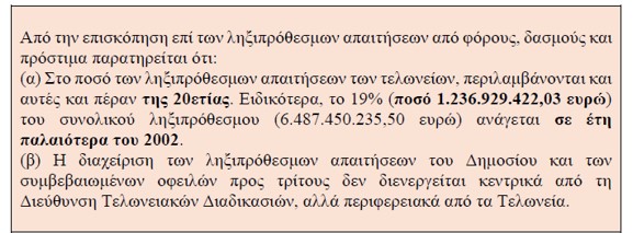 Συνεχίζοντας με την ΑΑΔΕ των ξένων (ανάλυση), το ΕΣ αναφέρει πιθανότητα «λαθών» – κάτι που μπορεί να καταστήσει αναξιόπιστα τα έσοδα της από φόρους, πόσο μάλλον από πρόστιμα, όπου στον απολογισμό του 2022 το 99% διαγράφθηκε ως μη εισπράξιμο! Το σημαντικότερο όμως είναι το ότι, υπάρχει μία σωρεία από ιδιαιτερότητες, όσον αφορά τα Τελωνεία που υπάγονται στην ΑΑΔΕ – όπως για παράδειγμα το ότι, δεν υφίσταται κατά το ΕΣ κεντρικό σύστημα παρακολούθησης ληξιπρόθεσμων απαιτήσεων, αλλά διεξάγεται αποκεντρωμένα από κάθε τελωνείο (εικόνα).