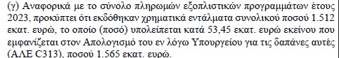 Περαιτέρω στις κρατικές δαπάνες, το ΕΣ διαπίστωσε πως έγιναν πληρωμές ύψους 53,45 εκ. € για εξοπλιστικά που «χάθηκαν» – ενώ όλοι γνωρίζουμε για σκάνδαλα που έχουν σχέση με τις αμυντικές δαπάνες (εικόνα).