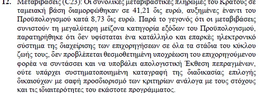 Ακόμη χειρότερα, οι μεταβιβαστικές πληρωμές του κράτους αυξήθηκαν κατά 8,73 δις € στα 41,21 δις €, παραπάνω από ότι προέβλεπε ο προϋπολογισμός (!) – ενώ το ΕΣ σημειώνει την ύπαρξη επιχορηγήσεων χωρίς μητρώο δικαιούχων, όπου ενδεχομένως συμπεριλαμβάνονται ΜΚΟ, ο χρεοκοπημένος ΟΠΕΚΕΠΕ, διάφορες αποζημιώσεις κλπ. Εδώ θα έπρεπε να διερευνηθεί τι ακριβώς συμπεριλαμβάνεται – αφού τα ποσά είναι τεράστια, όπως άλλωστε και οι υπερβάσεις (εικόνα).