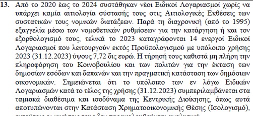 Ίσως το πολύ πιο χειρότερο είναι το ότι, ανοίγονται αδιαφανείς λογιστικοί λογαριασμοί ανεξέλεγκτα, χωρίς καμία αιτιολογία σύστασης τους, οι οποίοι αφορούν έσοδα και έξοδα – για τους οποίους και για τα οποία δεν ενημερώνονται ούτε η Βουλή, ούτε οι Πολίτες. Με την κοινή ορολογία, πρόκειται για «μαύρους λογαριασμούς» – οι οποίοι χρησιμοποιούνται για να διαμορφώνονται κατά το δοκούν τα διαθέσιμα του κράτους (εικόνα).