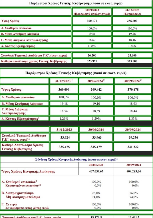 Όσον αφορά στο Δημόσιο Χρέος, έχουμε το εξής παράδοξο: Σύμφωνα με το Δελτίο Χρέους από τις 30.09.24, το χρέος της Γενικής Κυβέρνησης ήταν 370 δις € από 369 δις € την 31.12.23, ενώ, τα ταμειακά διαθέσιμα είναι 39,2 δις € από 33,6 δις €. Με βάση, όμως, το νέο Δελτίο Χρέους από τις 31.12.2023, το χρέος της Γενικής Κυβέρνησης ήταν 356 δις € την 31.12.23 και όχι 369 δις €.