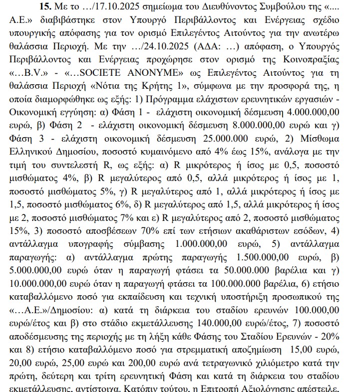 Ειδικότερα, αναφέρεται στο άρθρο 30.3 που προστέθηκε εκ των υστέρων στις 10.12.2025 (!) και αφορά το νότιο Κρητικό πέλαγος, οπως αναφέρει παρακάτω το ΕΣ, ενώ δεν δεν υπάρχει σε άλλες ότι, οι γεωγραφικές συντεταγμένες των νότιων και πλευρικών ορίων της συμβατικής περιοχής, μπορούν να αναθεωρηθούν από τον εκμισθωτή – σε περίπτωση συμφωνίας μεταξύ της Ελλάδας και ενός ή περισσότερων κυρίαρχων κρατών, η οποία οριοθετεί την υφαλοκρηπίδα ή την ΑΟΖ της Ελλάδας στην συμβατική περιοχή.