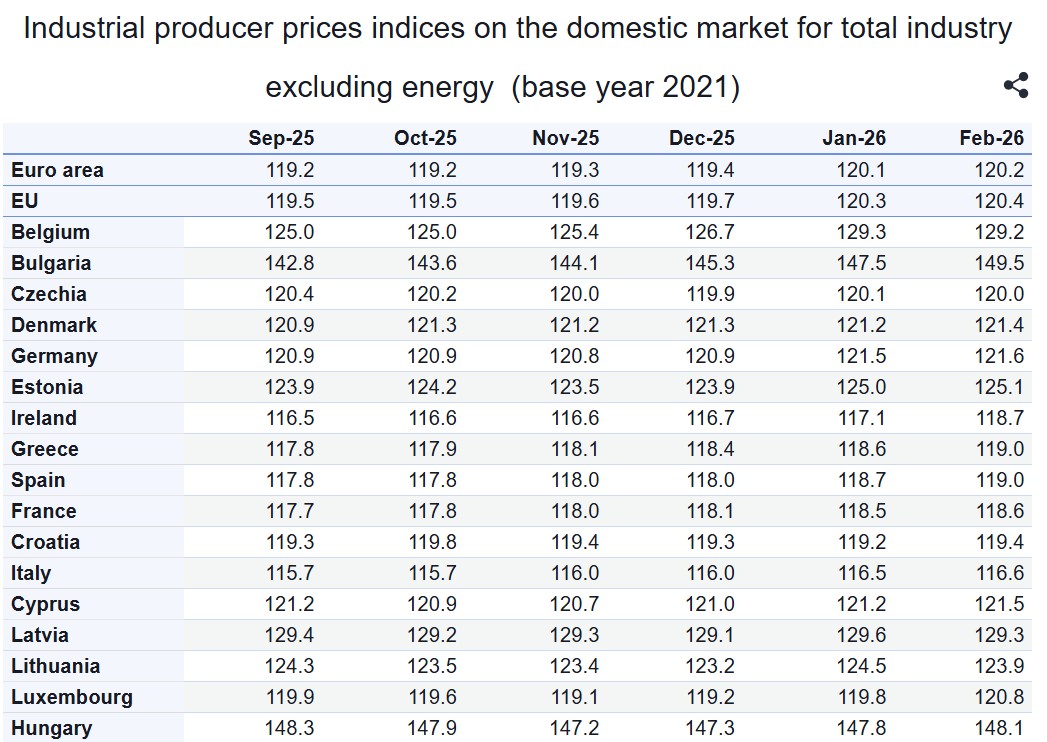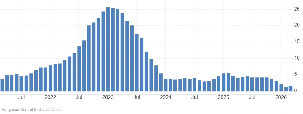 Σήμερα βέβαια οι τιμές καταναλωτή και οι τιμές παραγωγού στον ουγγρικό μεταποιητικό τομέα αυξάνονται μεν πια ελαφρώς, αλλά η χώρα έχει επωμισθεί ένα τεράστιο βάρος από τα προηγούμενα χρόνια – με το δείκτη τιμών παραγωγού (χωρίς την ενέργεια) να ευρίσκεται στις 148,1 μονάδες στις αρχές του 2026, στο ίδιο επίπεδο περίπου με τη Βουλγαρία, ενώ τα στοιχεία για τις άλλες χώρες είναι σχεδόν ομοιόμορφα στις 120 μονάδες (γράφημα, πηγή).
