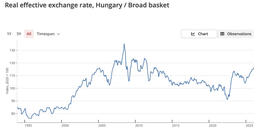 Το γεγονός αυτό συνέβαλε σημαντικά στην αύξηση του τιμαρίθμου, του πληθωρισμού δηλαδή, ιδίως το 2022 και το 2023 (γράφημα) – με αποτέλεσμα από το 2024 και μετά να ήταν η ανταγωνιστική πίεση στις ευρωπαϊκές αγορές τόσο έντονη, ώστε ακόμη και οι παραγωγικές επιχειρήσεις της Ουγγαρίας να μην μπορούν πλέον να μετακυλίσουν πλήρως το κόστος εργασίας στις τιμές πώλησης τους.